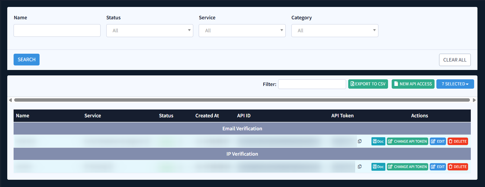 - Filter API access records by name, status, service, and category to quickly locate the specific records you need.
