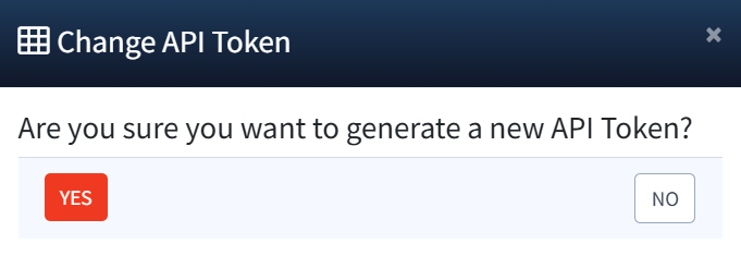 To change the API token, click the Change API Token button in the Actions column. Then click Yes in the pop-up window to confirm.