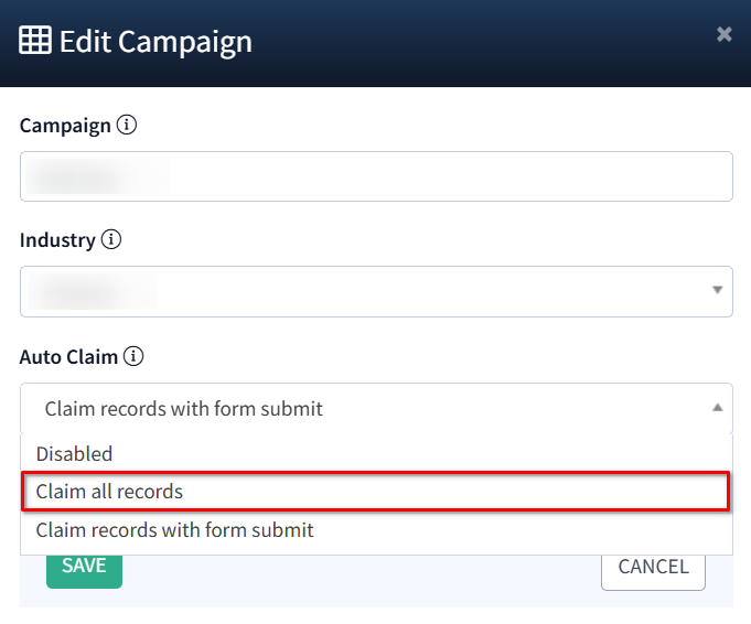 - Once you’ve made your selection, click Save to apply the changes. From now on, all records under this campaign will be automatically claimed upon generation.