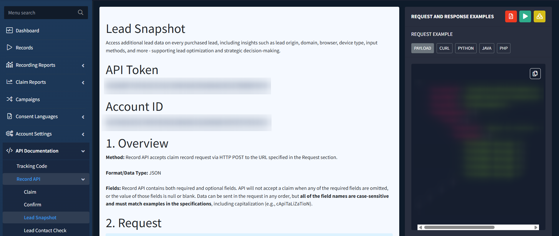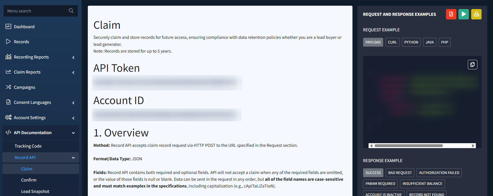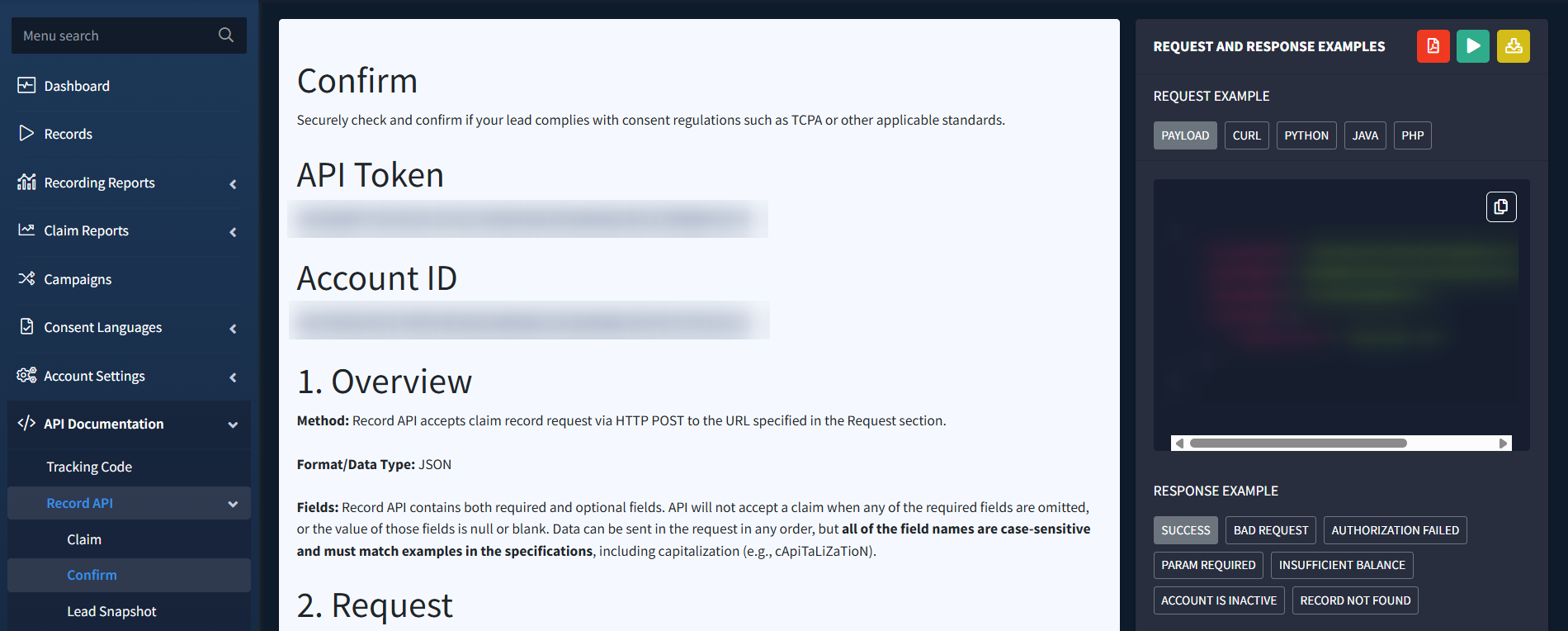 You can view the API Documentation for the iClaim Confirm operation along with all the possible request and response examples via the API Documentation > Record API > Lead Snapshot section.