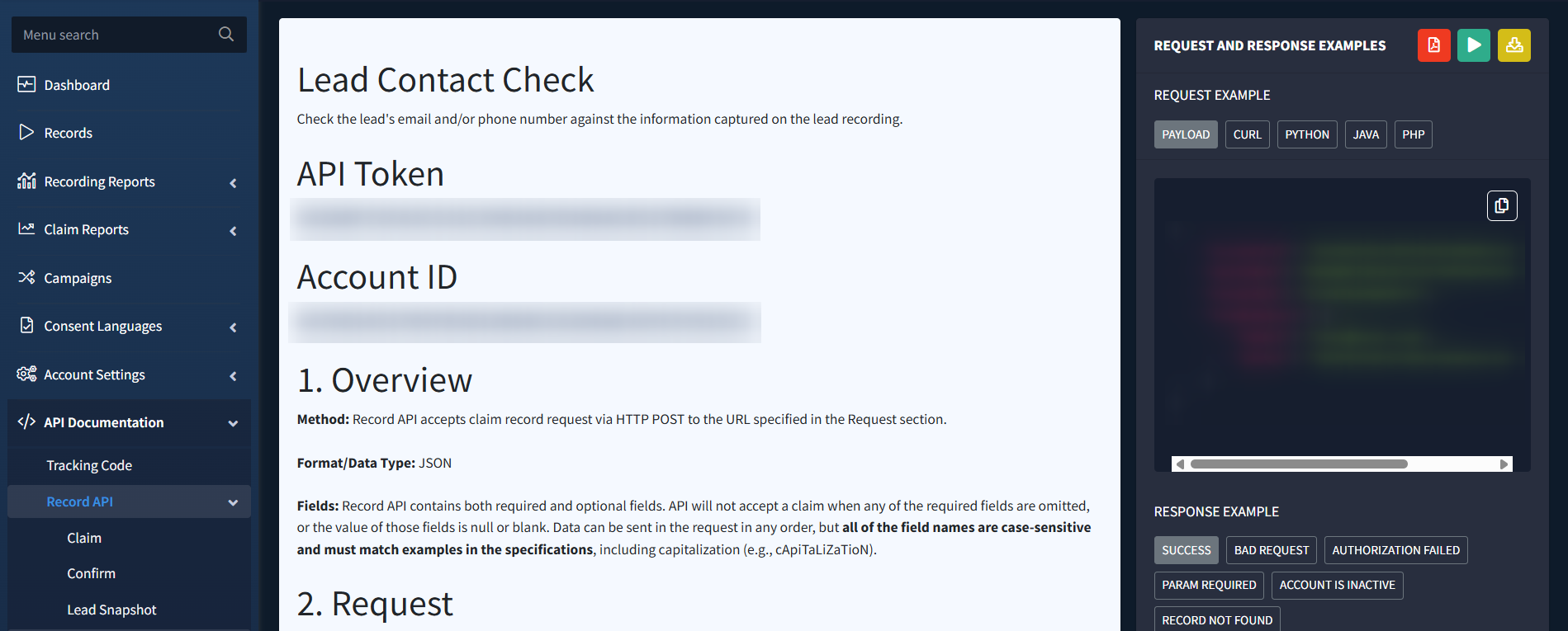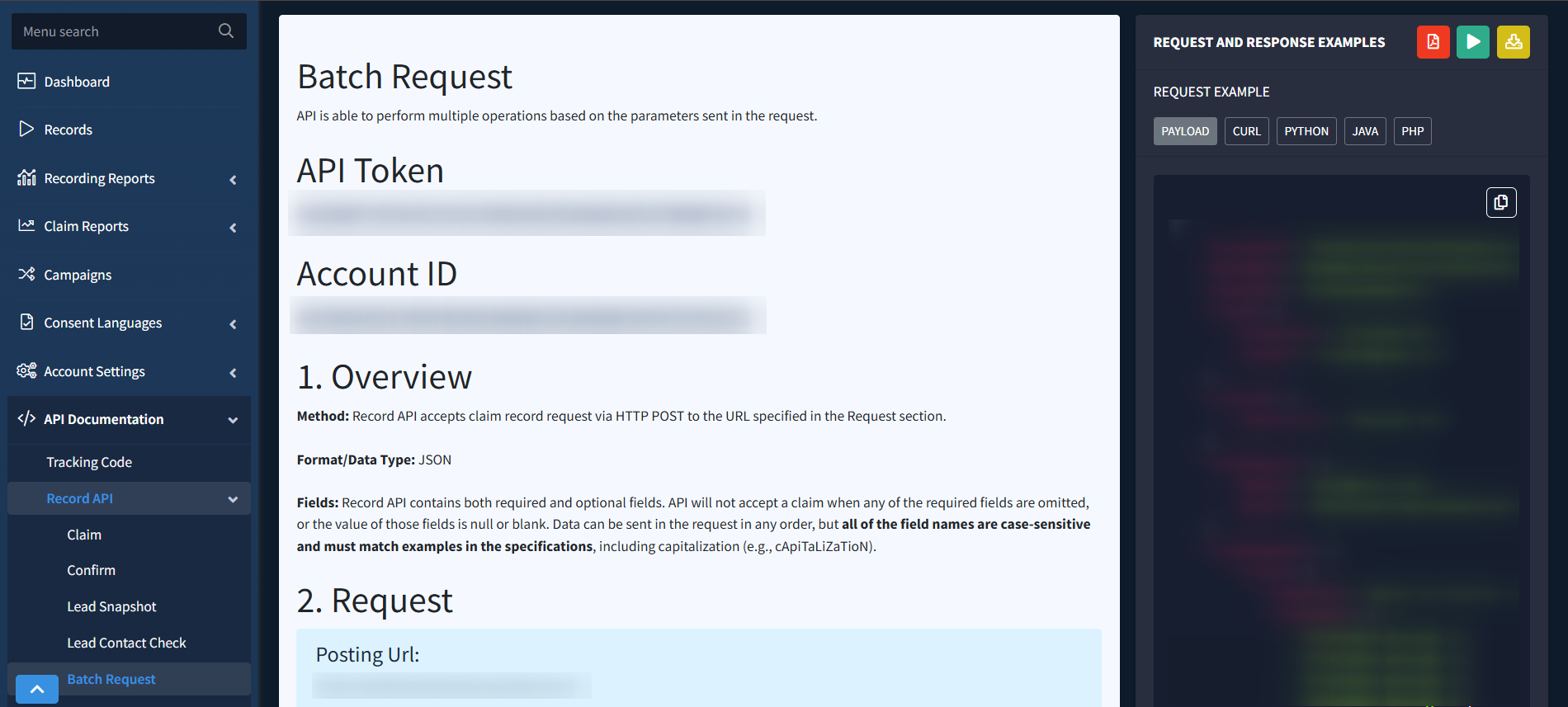 You can view the API Documentation for the Lead Batch Request API operation along with all the possible request and response examples via the iClaim > API Documentation > Record API > Batch Request section.