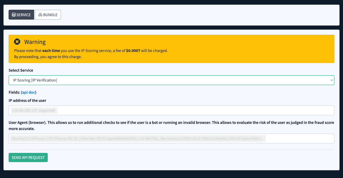 After selecting the desired service, fill in the required fields and click the “Send API Request” button to complete the action. Before sending the API request, review the information shown in the “Warning” pop-up.