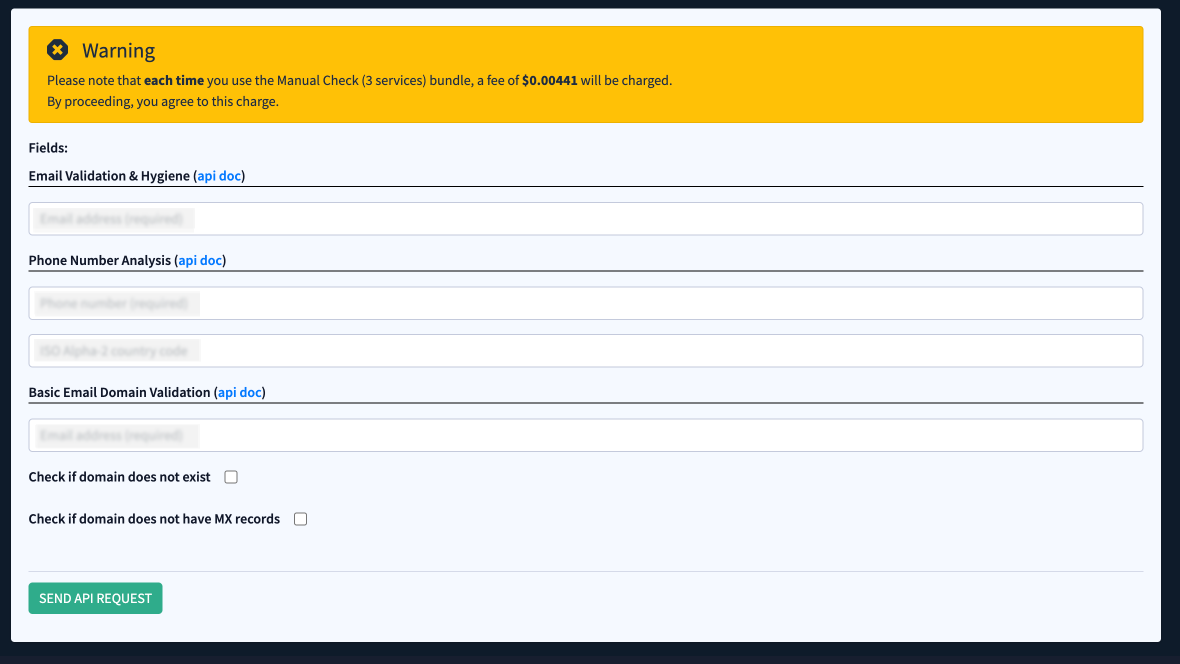 You will be redirected to the section where the required fields for the combined API request are displayed. The system automatically compiles all necessary fields from the individual services into one combined form. Fill in the fields from the list, and click the “Send API Request” button to complete the action. To view additional information about API documentation for every request from the bundle, click the “api doc” link next to the particular service.