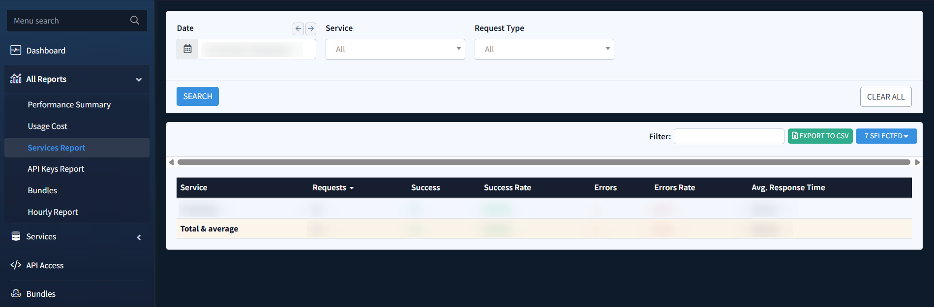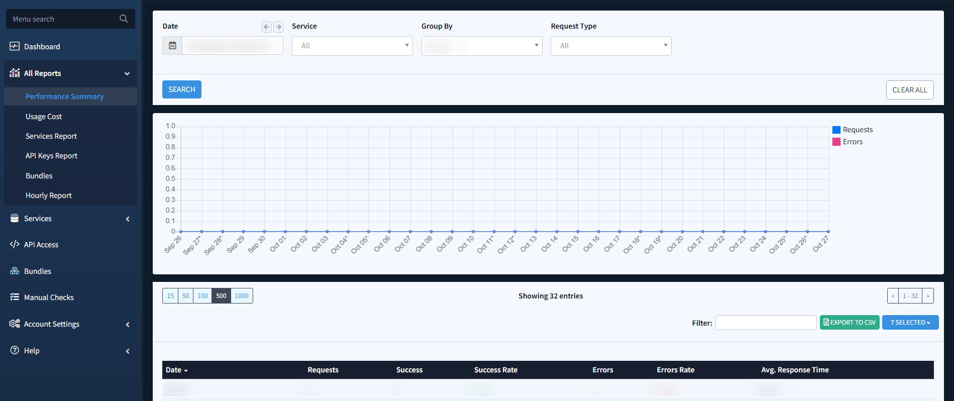 The Reports section in iClear provides visibility into system usage, performance, and costs. These reports allow users to monitor requests, analyze errors, review API behavior, and track spending with flexible filtering and export options.