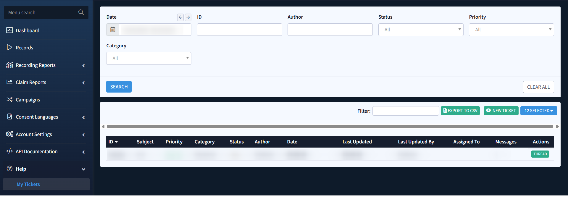 To manage the existing ticket: view the ongoing information, send a reply, etc., select the corresponding ticket from the list, click the link with the ticket ID in the ID column, or click the Thread button in the Actions column.