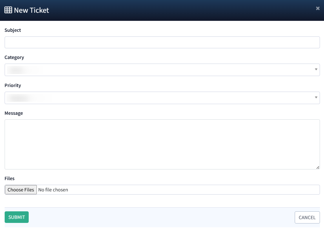 To create a new ticket, click the New Ticket button, fill in the subject of the ticket, select the related category of the issue or question, set up the priority level, add the corresponding description for the ticket, and attach the file that gives more details on the described question. Click the Submit button to complete the ticket’s creation process.