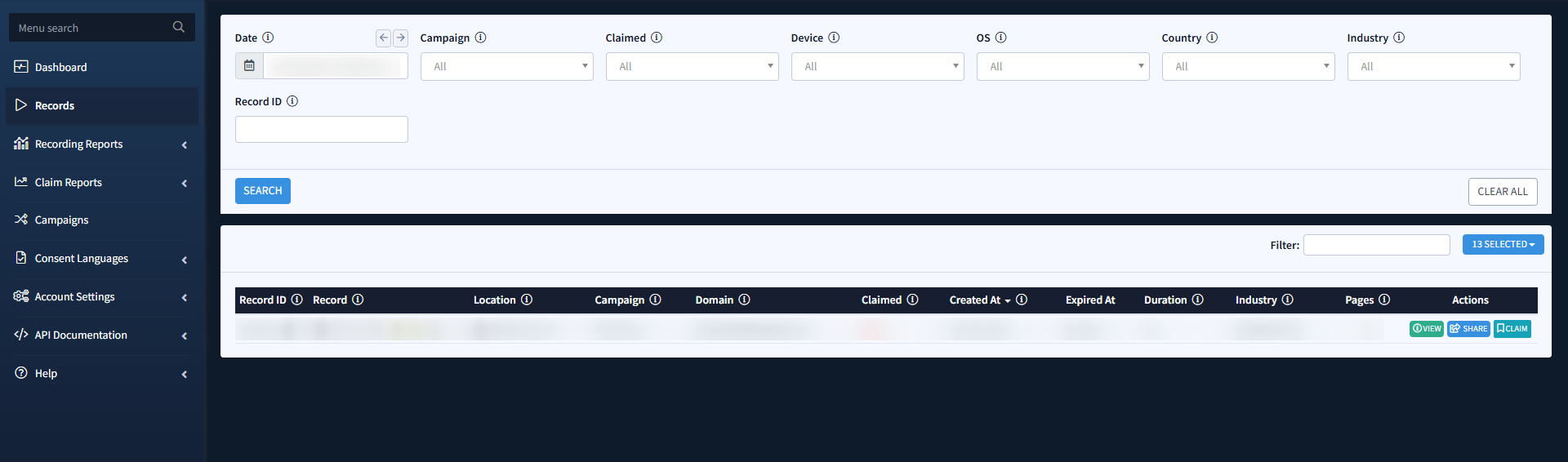 • Record ID: A unique identification number assigned to each Record, generated when a user lands on a website where an iClaim Tracking Code is installed. To copy the Record ID, click the “Copy Record ID” button.