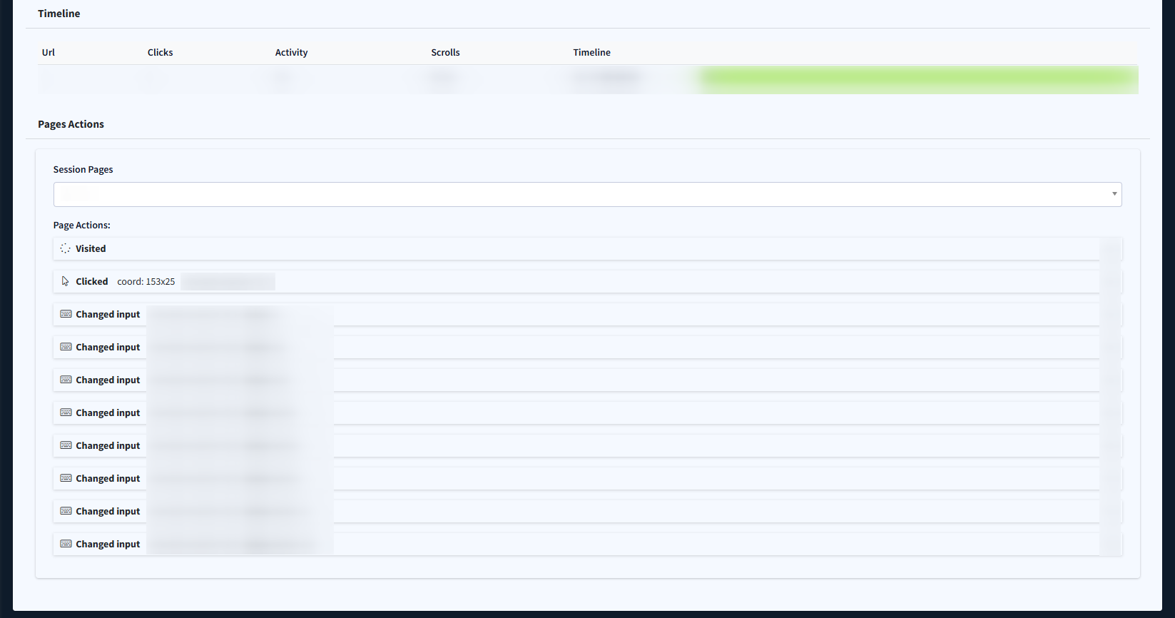 • Pages Actions: This block contains a log of all user actions performed on the form or webpage, including the activity name, the element interacted with, and any associated values related to the activity.