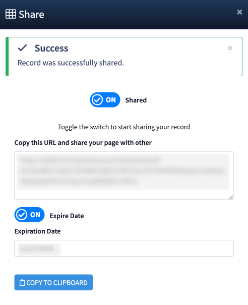 To share your record via a unique URL, click the “Share” button in the “Actions” column. In the pop-up, switch the Shared toggle to ON to generate a unique, secure, shareable RecordURL.