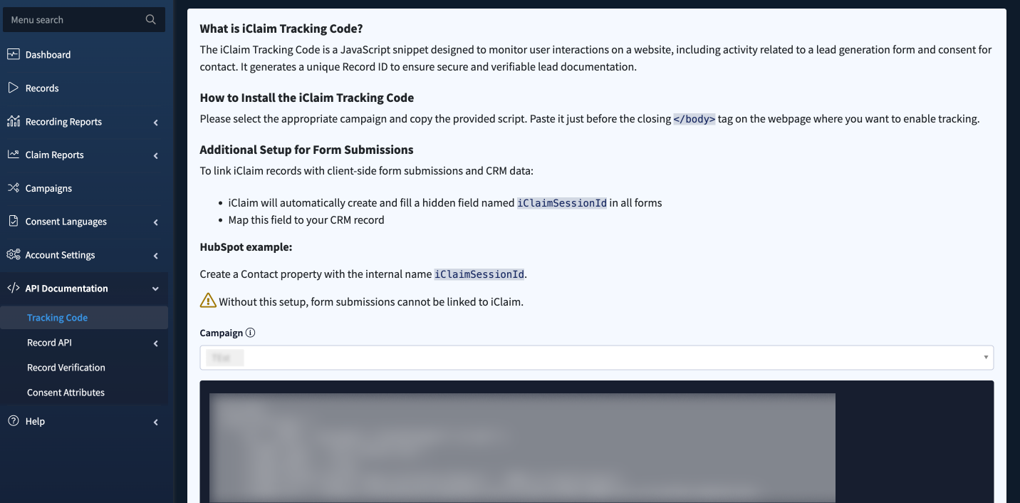 Note: To view your iClaim Tracking Code, go to the iClaim > API Documentation > Tracking Code section and select the corresponding Campaign.