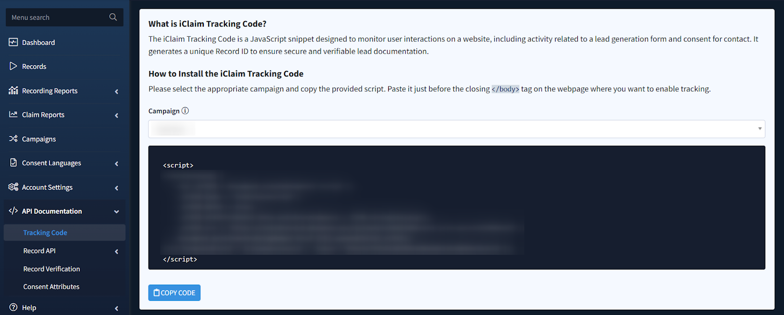 Note: To view your iClaim Tracking Code, go to the iClaim > API Documentation > Tracking Code section and select the corresponding Campaign.
